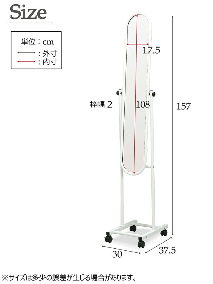 商品サイズ:幅30×奥行37.5×高さ157cm 4300g 材質:スチール(粉体塗装)、ミラー=3mm厚み 原産国:中国 組立品ミラーサイズ=約幅21.5×高さ118.5cm(最大)●キャスタータイプ、飛散防止加工ミラー、ミラー角度調節可。