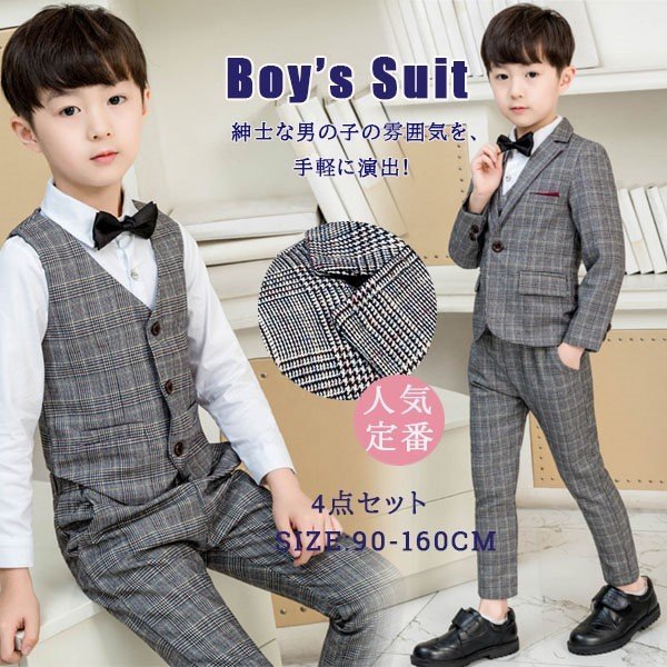 商品情報 商品詳細 商品内容:ジャケット+ズボン+ベスト+蝶ネクタイ商品素材:綿、ポリエステル、その他商品サイズ詳細 90 着丈40cm バスト61cm 肩幅25cm ズボン丈58cm ウェスト47cm おすすめ体重85-95cm100 着丈43cm バスト64cm 肩幅26cm ズボン丈62cm ウェスト50cm おすすめ体重95-105cm 110 着丈46cm バスト67cm 肩幅27cm ズボン丈66cm ウェスト54cm おすすめ体重105-115cm120 着丈49cm バスト70cm 肩幅28cm ズボン丈71cm ウェスト57cm おすすめ体重115-125cm130 着丈52cm バスト73cm 肩幅29cm ズボン丈76cm ウェスト61cm おすすめ体重125-135cm140 着丈55cm バスト77cm 肩幅30cm ズボン丈81cm ウェスト64cm おすすめ体重135-145cm150 着丈58cm バスト82cm 肩幅31cm ズボン丈86cm ウェスト68cm おすすめ体重145-155cm160 着丈61cm バスト86cm 肩幅32cm ズボン丈91cm ウェスト71cm おすすめ体重155-165cmフォーマルスーツ 男の子 スーツ キッズ 子供 4点セット ベスト 上下セット セットアップ タキシード ストライプ ジュニア 入学式 卒業式 七五三 結婚式 発表会 フォーマルスーツセット大人気♪