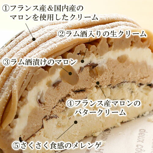 <こんな食感を味わっていただけます> ・フランス産&国内産のマロンを使用したマロンクリーム⇒フルーティーで香りの良いフランス産とコク豊かで味わいの強い国内産両方をブレンドし、マロンの味と香りをどちらも楽しんでいただけます。