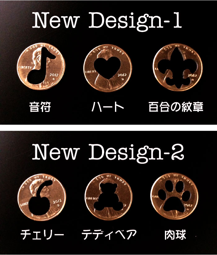 ペニーコイン(USA1セント)を11種類のデザインでくり貫いたストラップ。